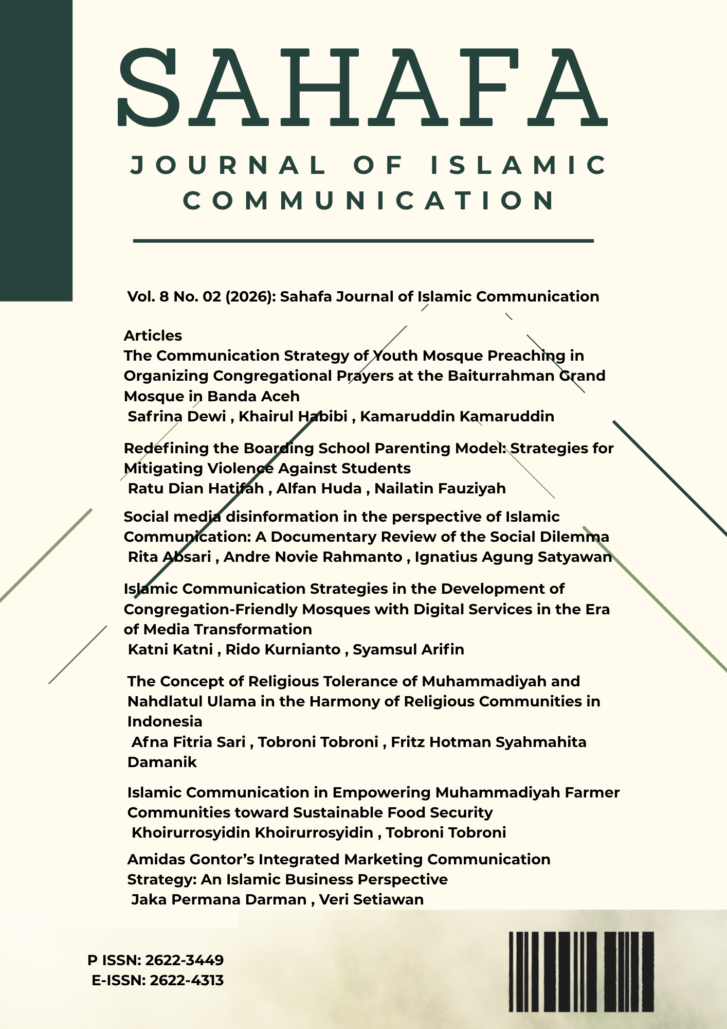 Sahafa Journal of Islamic Communication registered with ISSN 2622-3449 (Print) and ISSN 2622-4313 (Online) The selected paper published by Sahafa Journal of Islamic Communication is under a Creative Commons Attribution ShareAlike 4.0 International License is a blind peer-reviewed journal published semi-annual ( January and July) by Universitas Darussalam Gontor incorporate with The Indonesian Communication Scholars Association: Ikatan Sarjana Komunikasi Indonesia (ISKI) and Indonesian Da'wah Professional Association: Asosisasi Profesi Dakwah Indonesia (APDI)